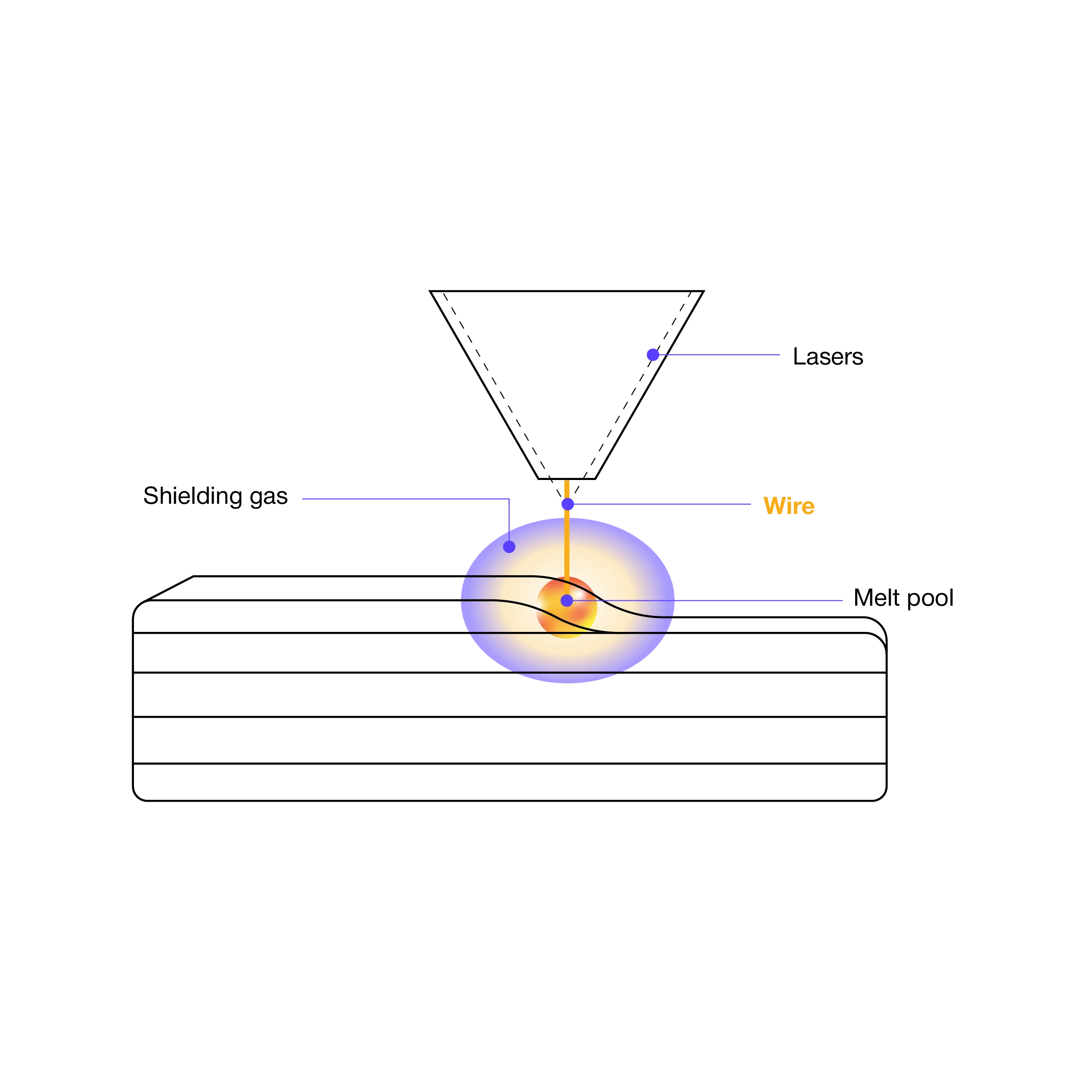 Meltio’s LMD ensures precise control over the wire as it enters the melt pool coaxially. The wire melts at the point of contact with the substrate, independent of the material flow. This allows for the implementation of a sophisticated feedback system, ensuring a stable and controlled process.