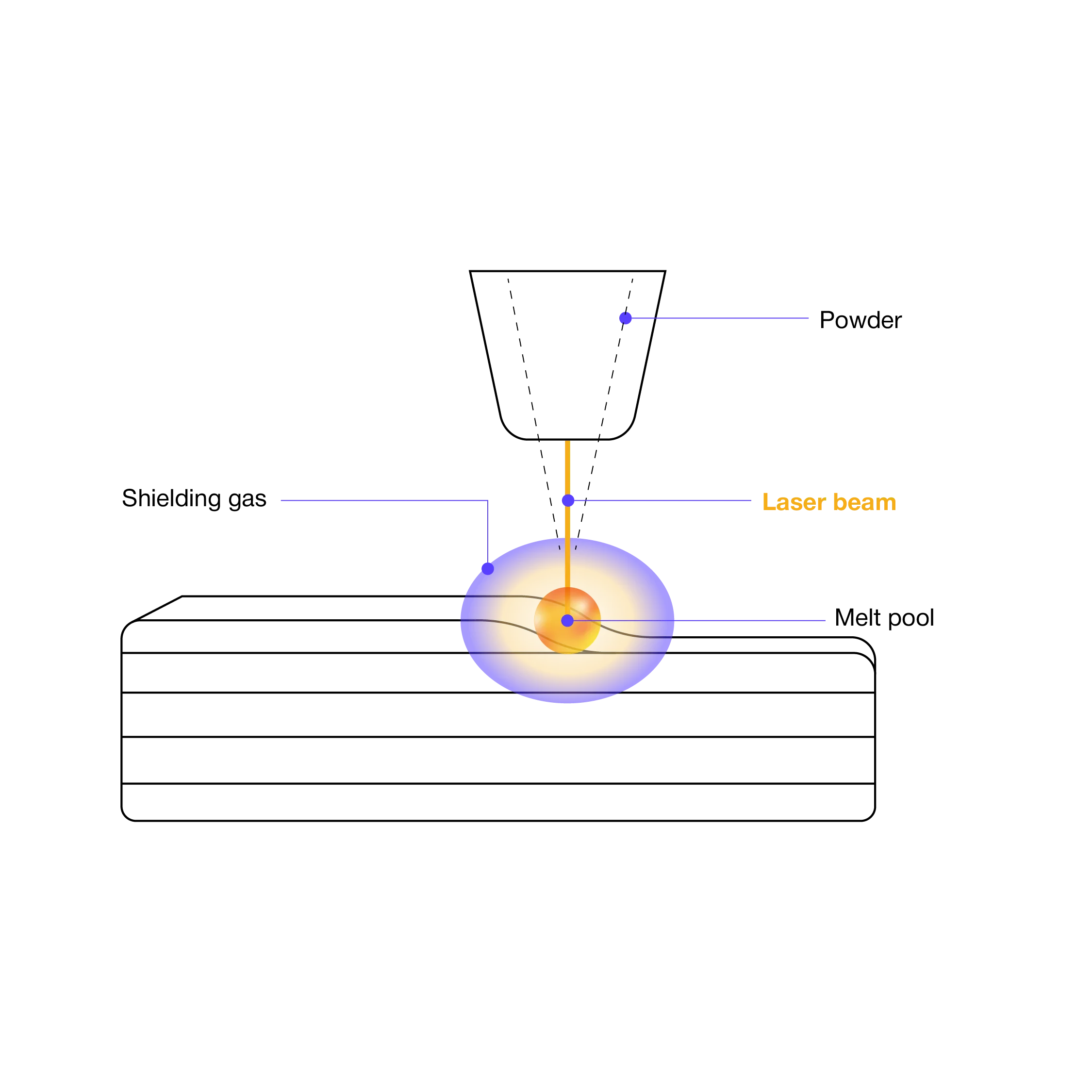 However, in powder-fed Direct Energy Deposition (DED) systems, powder is continuously directed through nozzles aimed at the focal point of a high-powered laser. The heat from the laser melts the metal powder, forming a molten pool. This molten material is then moved by a motion control system, and the part is constructed layer by layer in free space. The entire process is visible as the part gradually takes shape with each added layer.