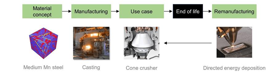 Remanufacturing worn, or damaged Mn steel parts by DED will be pioneered, by developing dedicated DED material feedstock, extending their service life and promoting resource conservation.